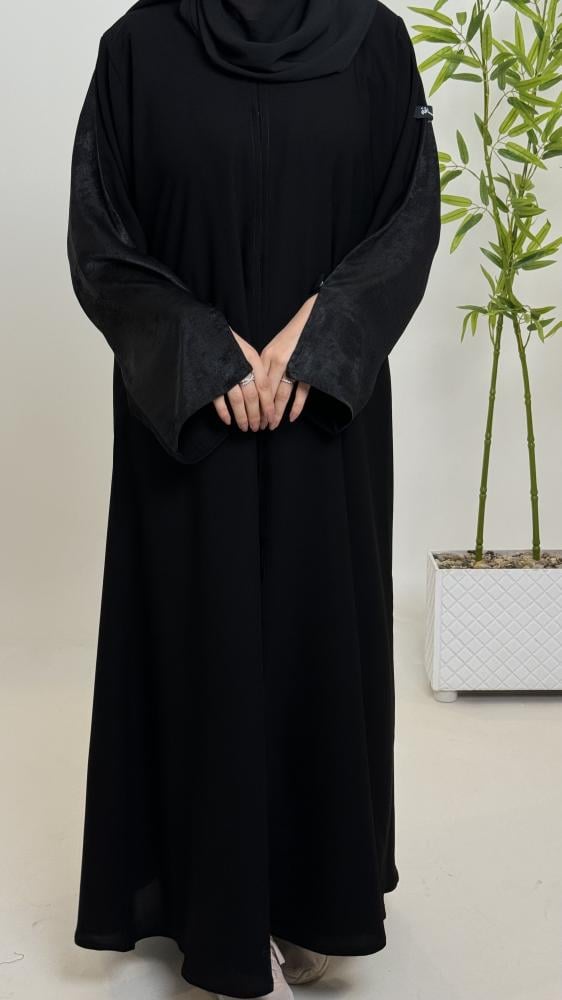 - أكمام فاخرة: قماش حرير كوري ناعم ولامع يضفي لمسة من الرقي والفخامة على العباية.