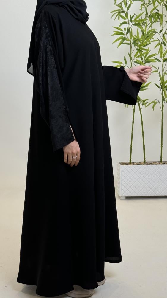 تصميم فريد: قصة عصرية وأنيقة بأجود أنواع الأقمشة تضمن لك إطلالة لا مثيل لها, أكمام فاخرة بقماش حرير كوري ناعم ولامع يضفي لمسة من الرقي والفخامة على العباية, طرحه سوداء سادة.